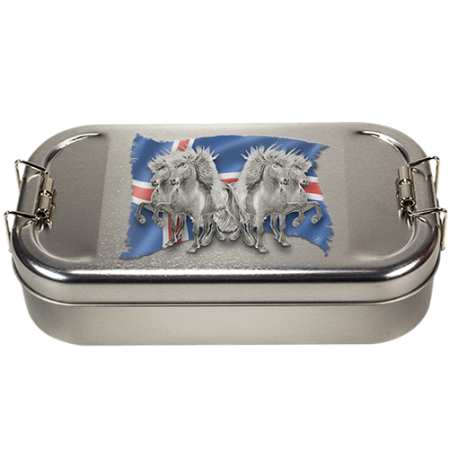 This noble lunch box made of pure tinplate with a snap on lid and vintage clip lock is the contemporary packaging of your daily provisions - of course it is also happy to accommodate your treats for horses and dogs. The vintage look with a striking motif print makes it a must have for all Icelandic horse fans.